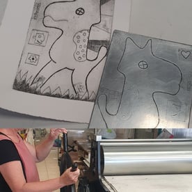 Découvrir la gravure avec le Tetrapak comme support. Ce carton recyclable est plein de ressources ! On peut simplement y dessiner son projet à la pointe sèche mais pourquoi pas aussi le découper, le déchirer, le coller et plus encore… Une fois la matrice ou les matrices créées suivront des étapes plus académiques : l’encrage en une ou plusieurs couleurs, l’essuyage, la préparation du papier et enfin le passage à la presse.